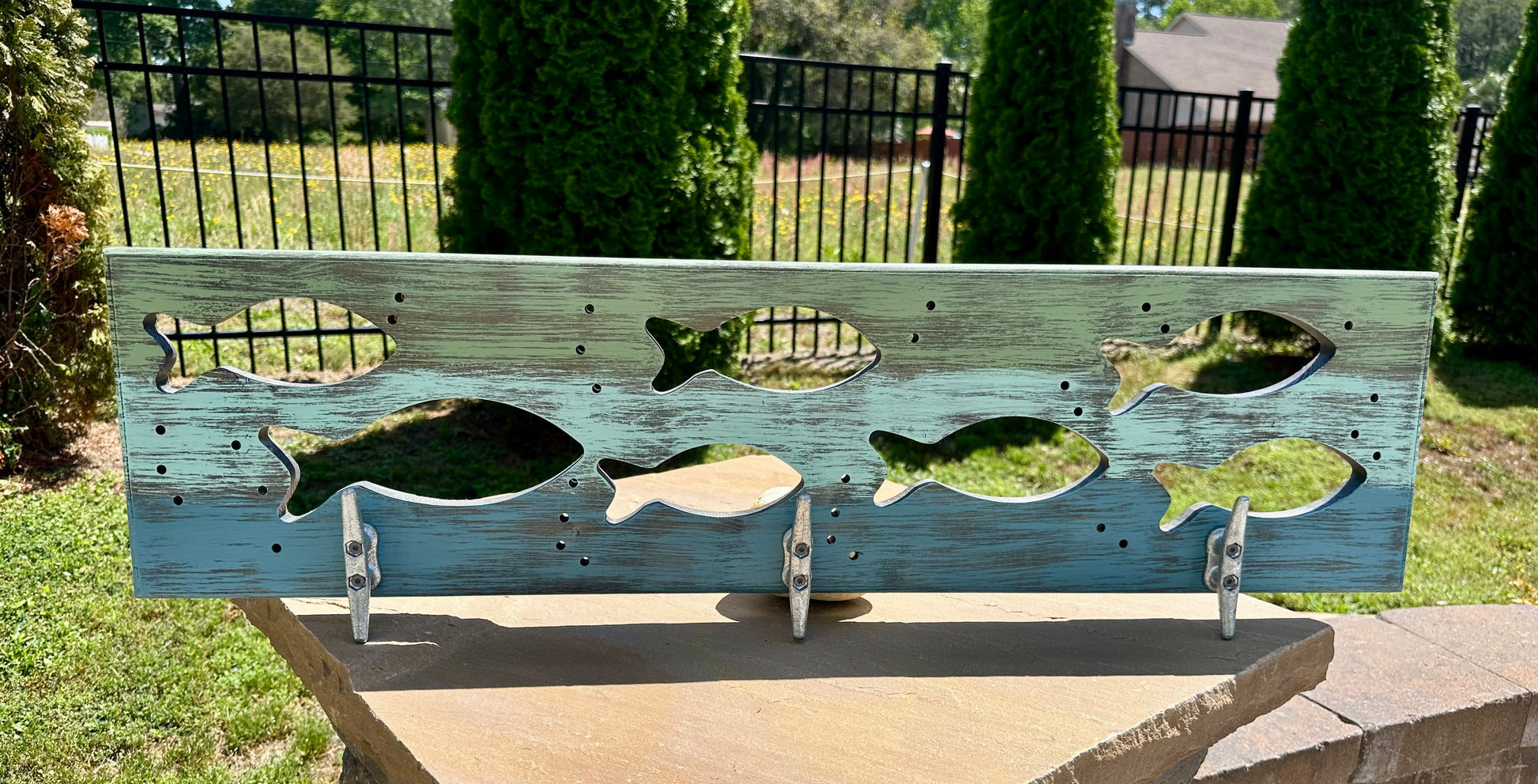 School of fish wooden towel rack with 3 (three) 4" galvanized cleats in your choice of silver or black finish. Measures 36"x9.25" Solid wood construction with installed wall mount hardware. Finished with exterior spray polyurethane.