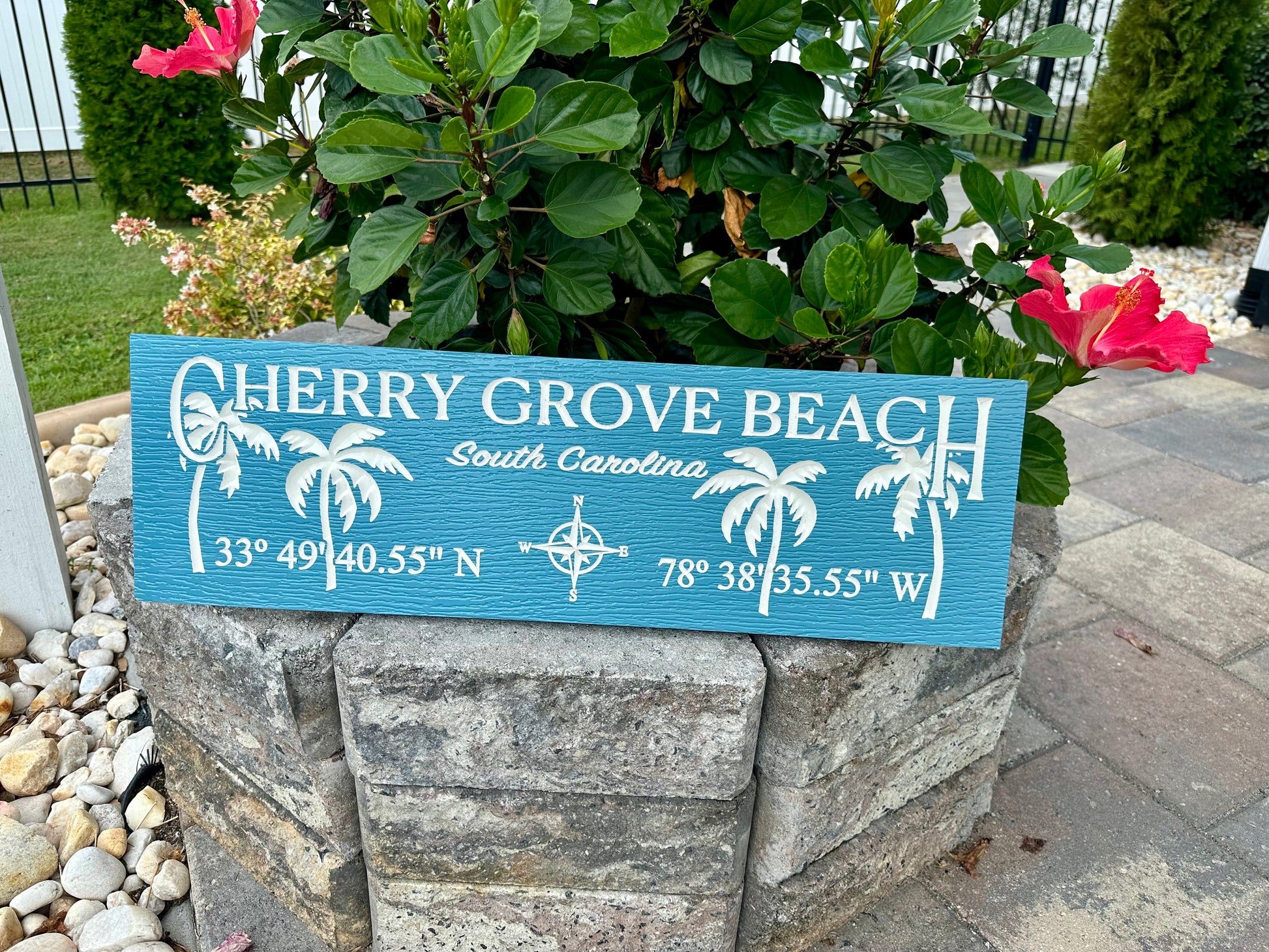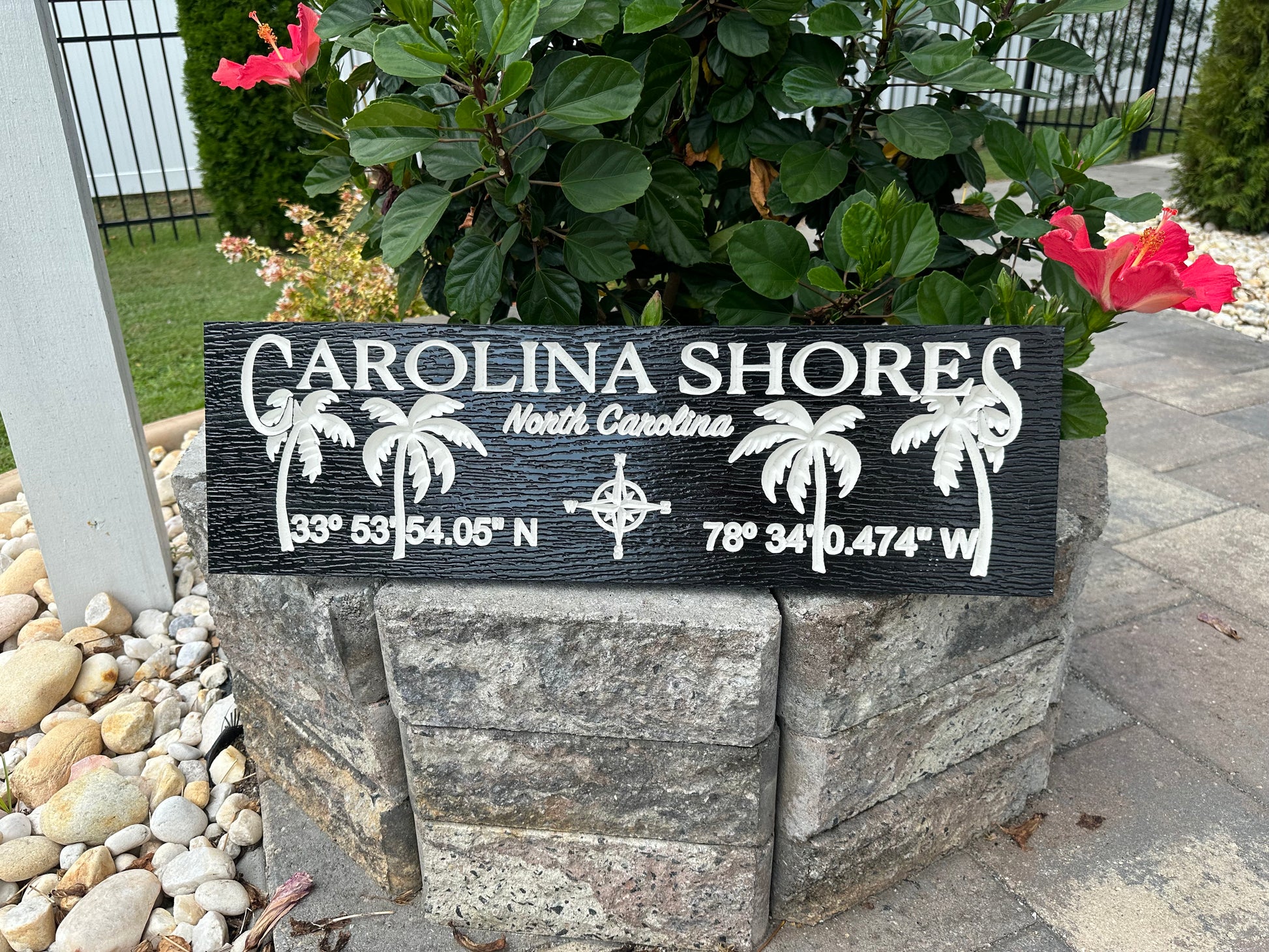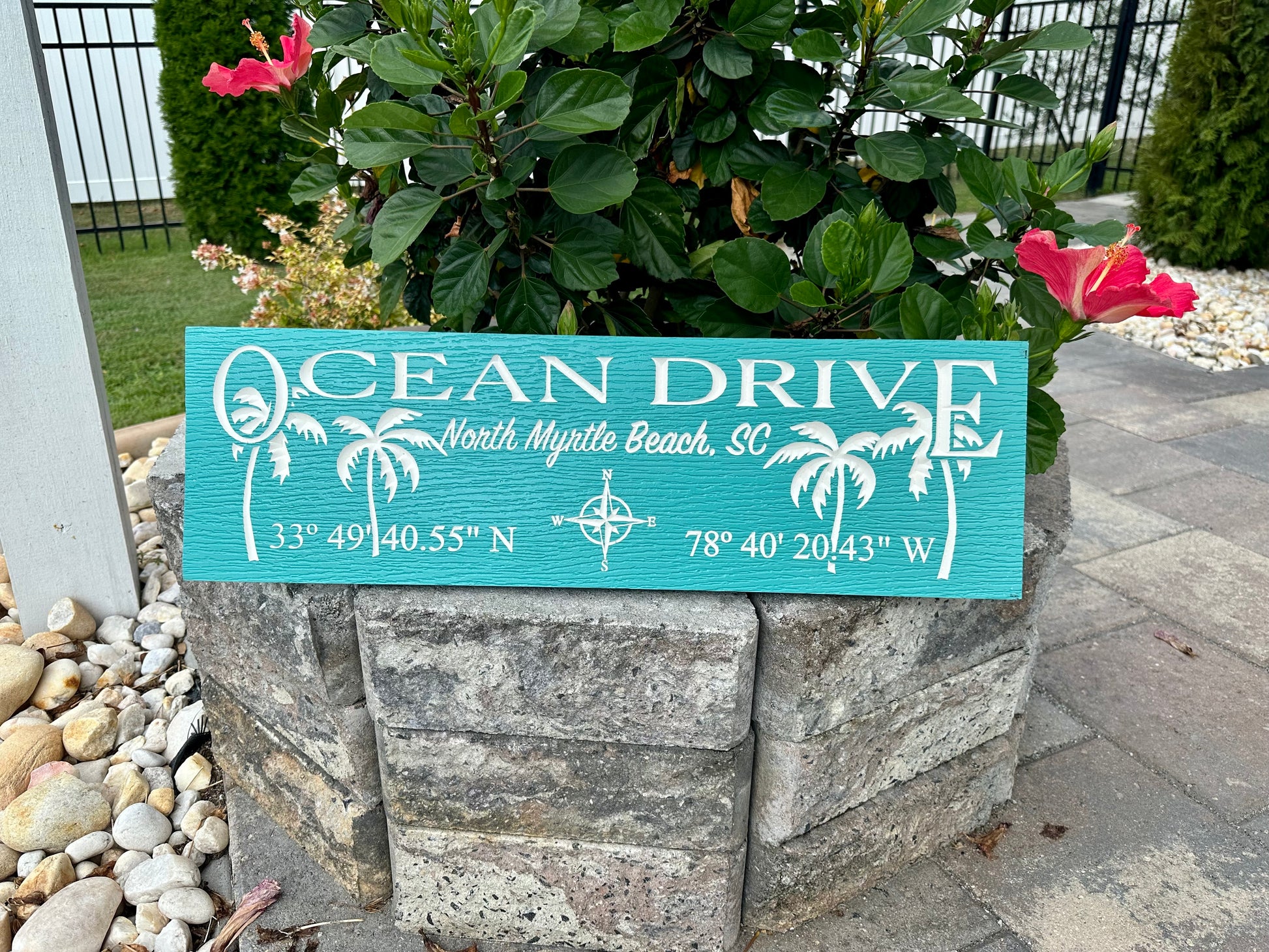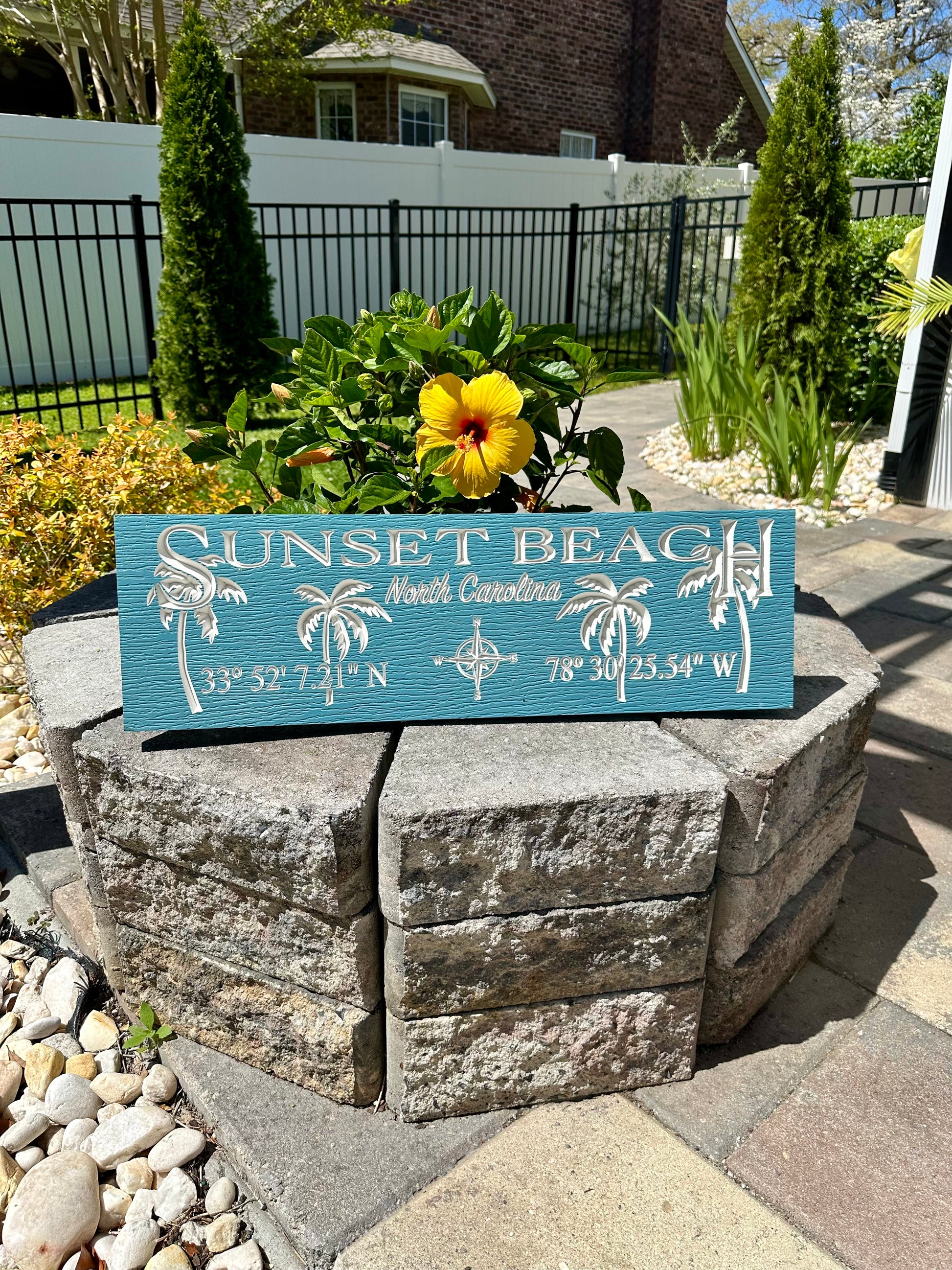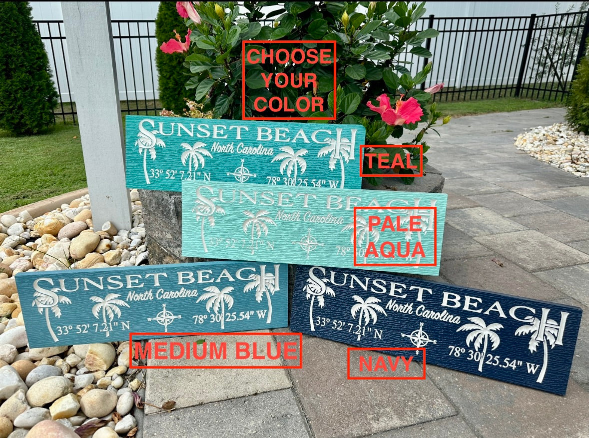 PVC painted sign engraved with your town name and coordinates and palm trees. Choice of colors. Sealed with exterior UV protection polyurethane spray. Measures 24"x7.25" Comes with 2 saw tooth hangers installed.
